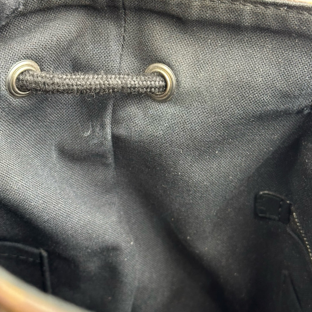 ベルト金具フラップ開閉の内側に巾着式開閉 |